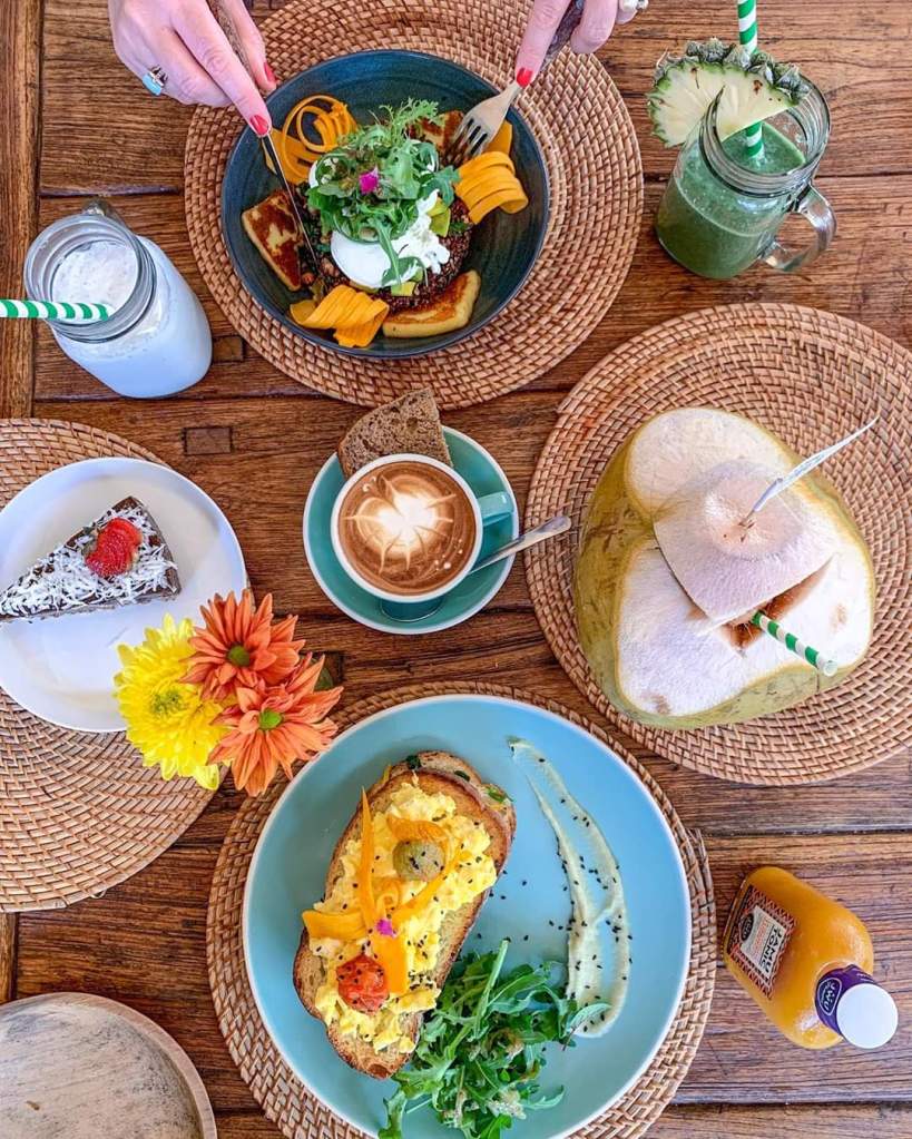 You can’t go wrong with rattan placemats. Get them here.Use blue ceramic plates.Beautiful colorful foods.Upload your customer’s experience.Put raffia pouch for photo prop.Just coffee.Delicious and healthy.