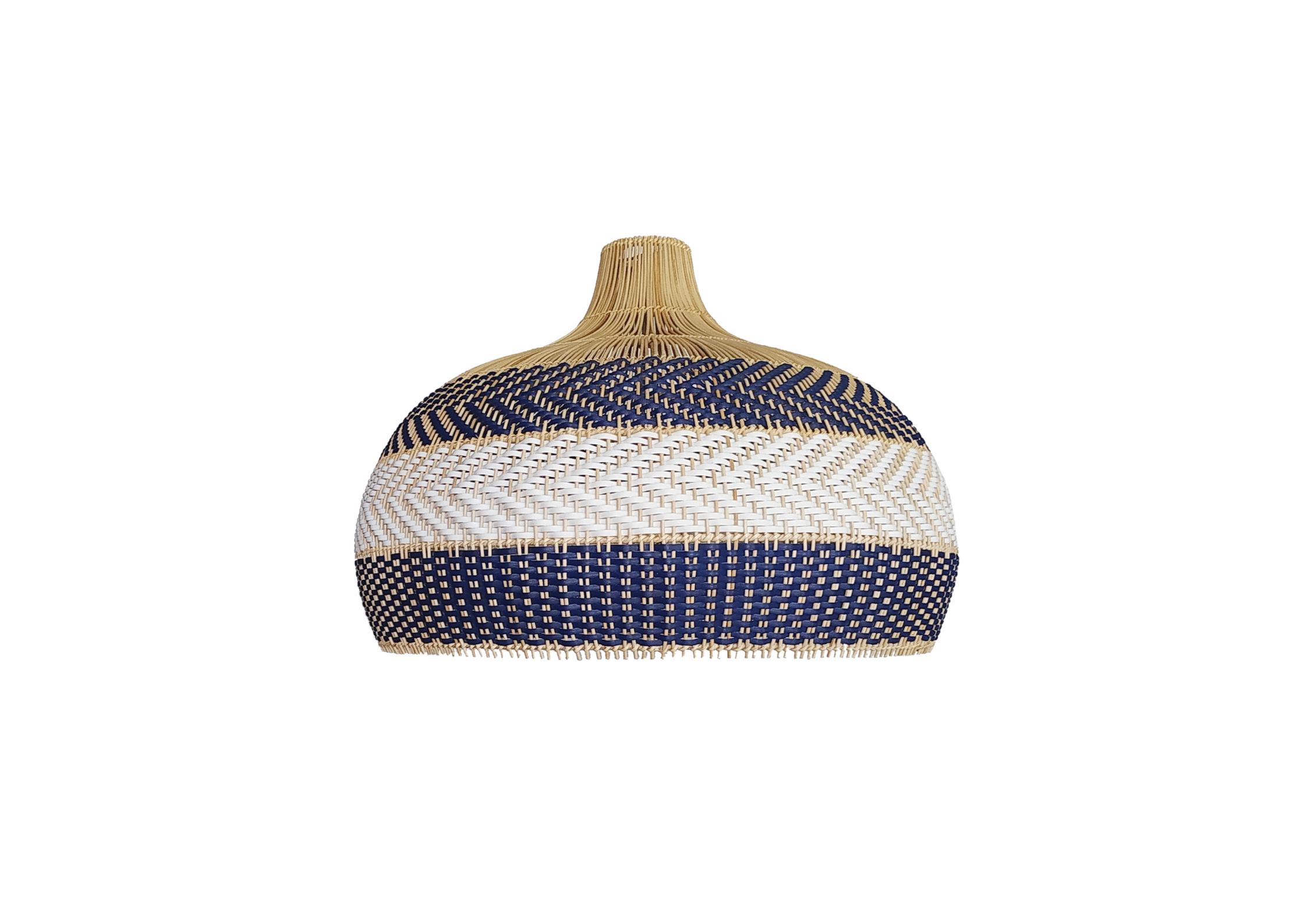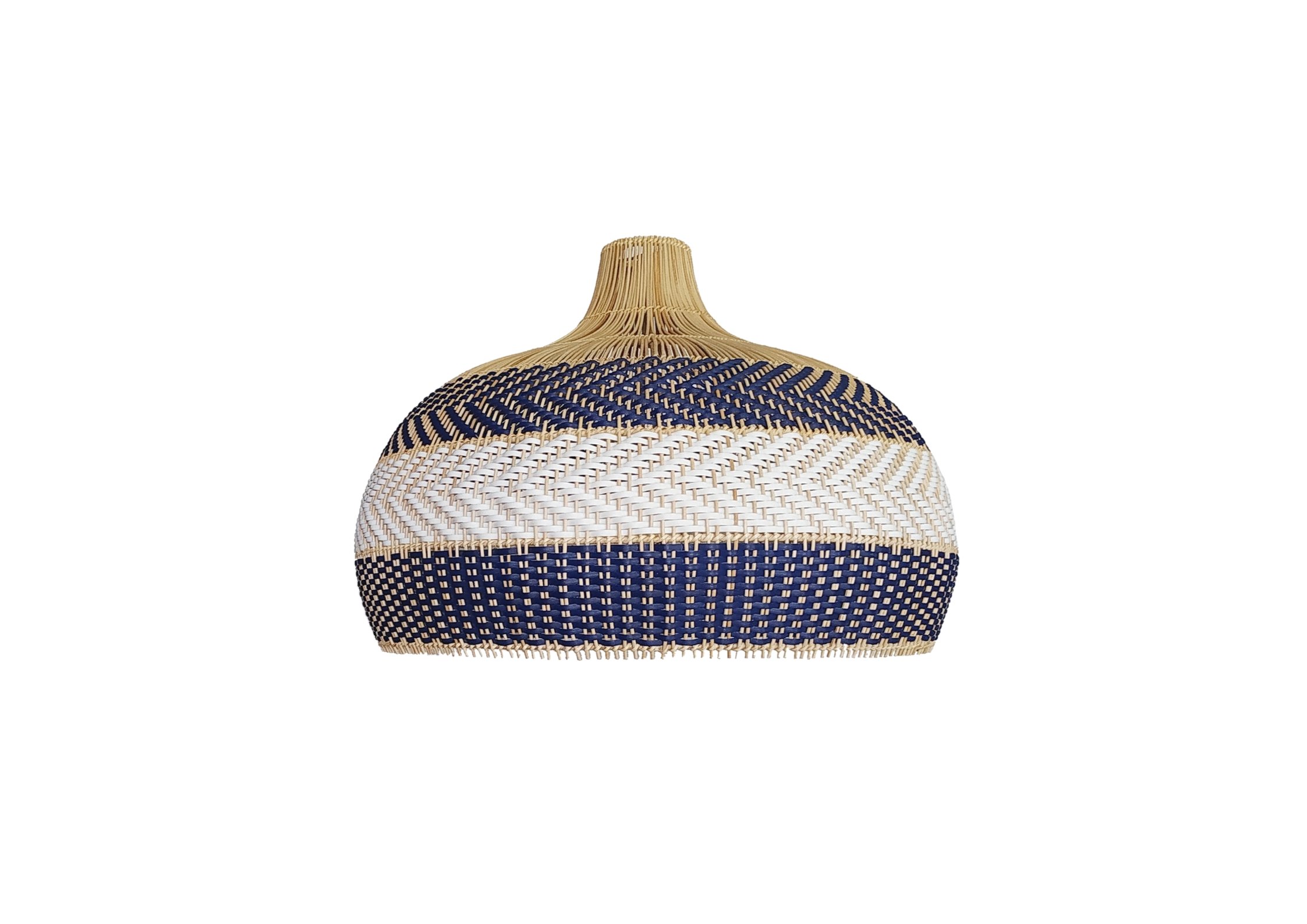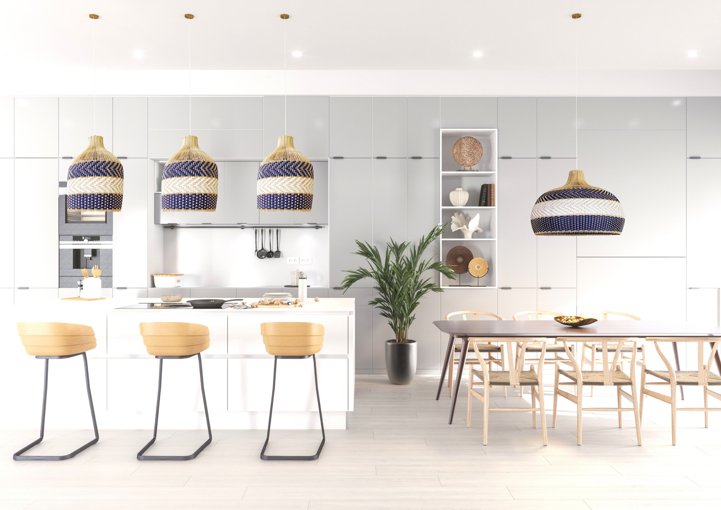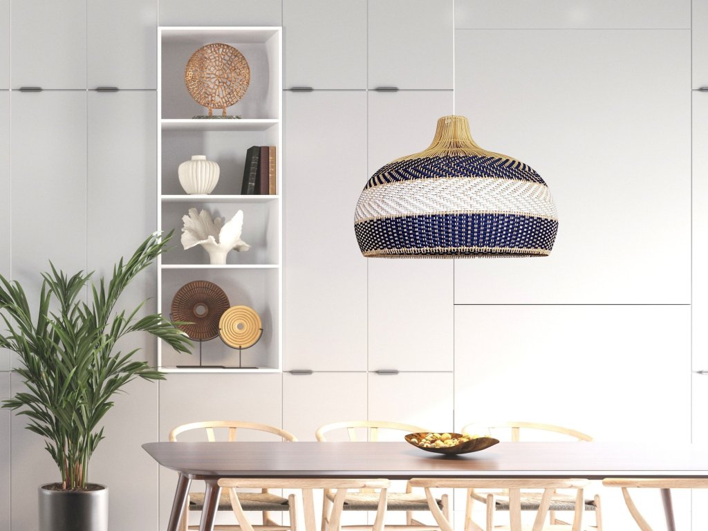 How to use more Hamptons blue and white in a dining room and kitchen with rattan chandelier