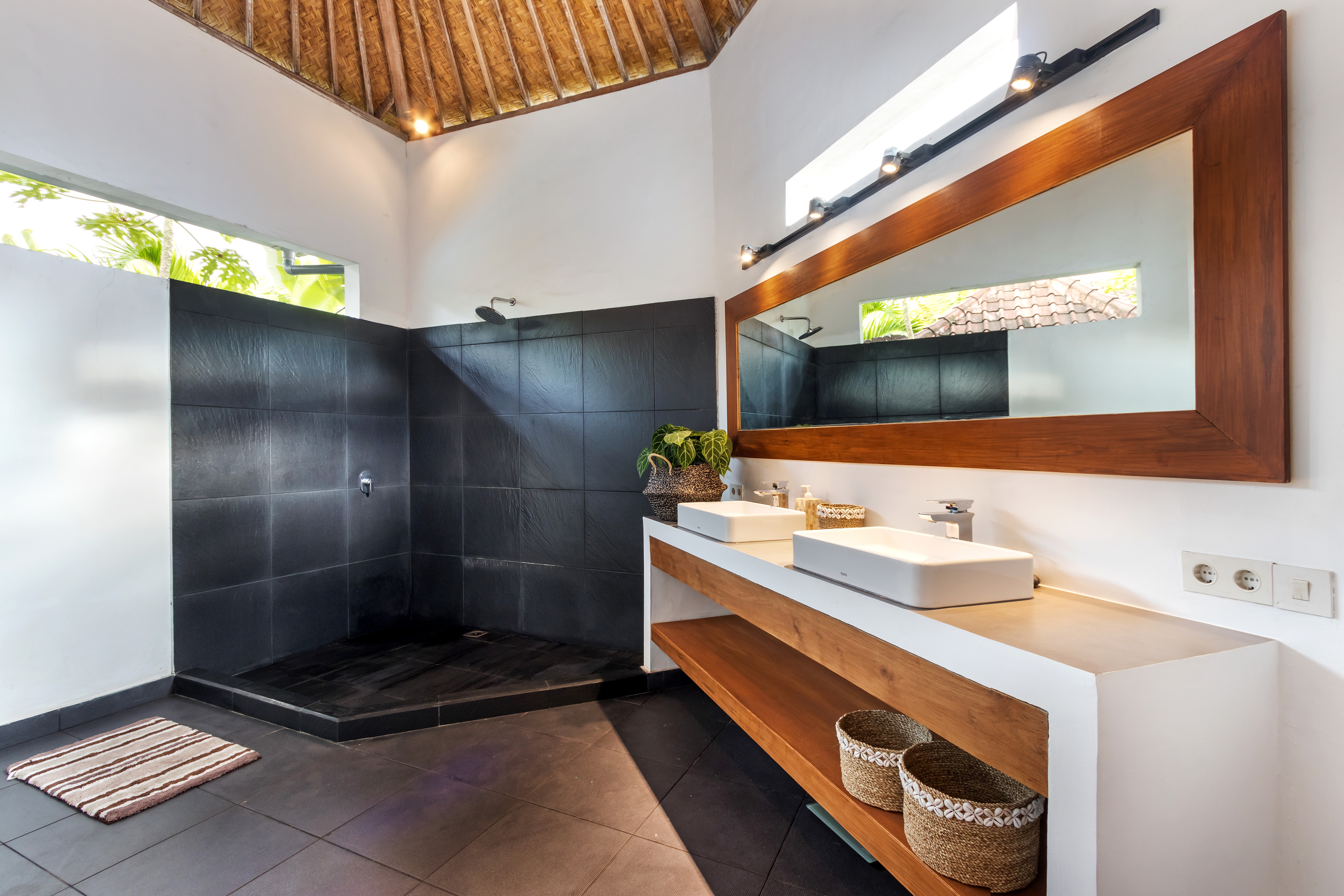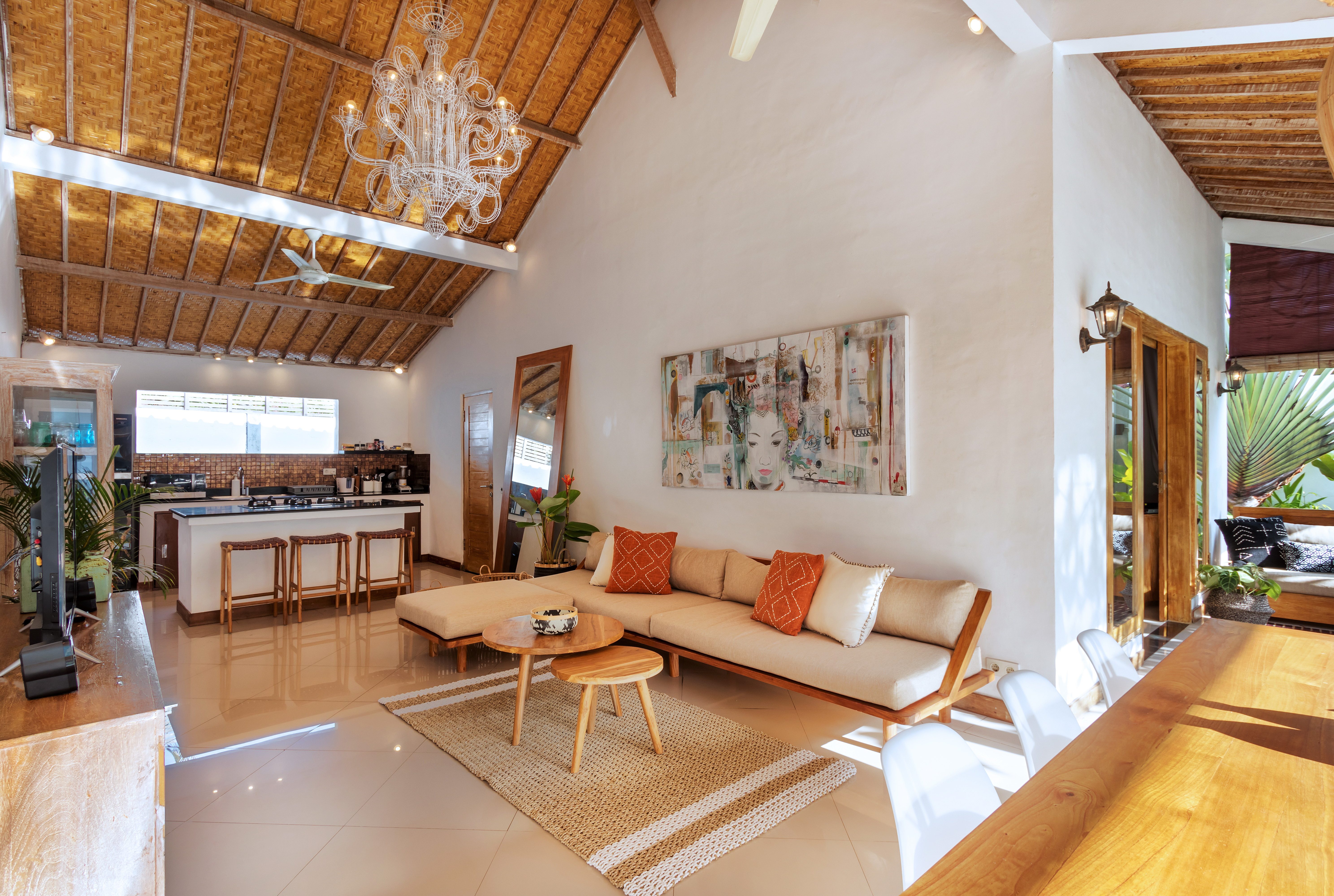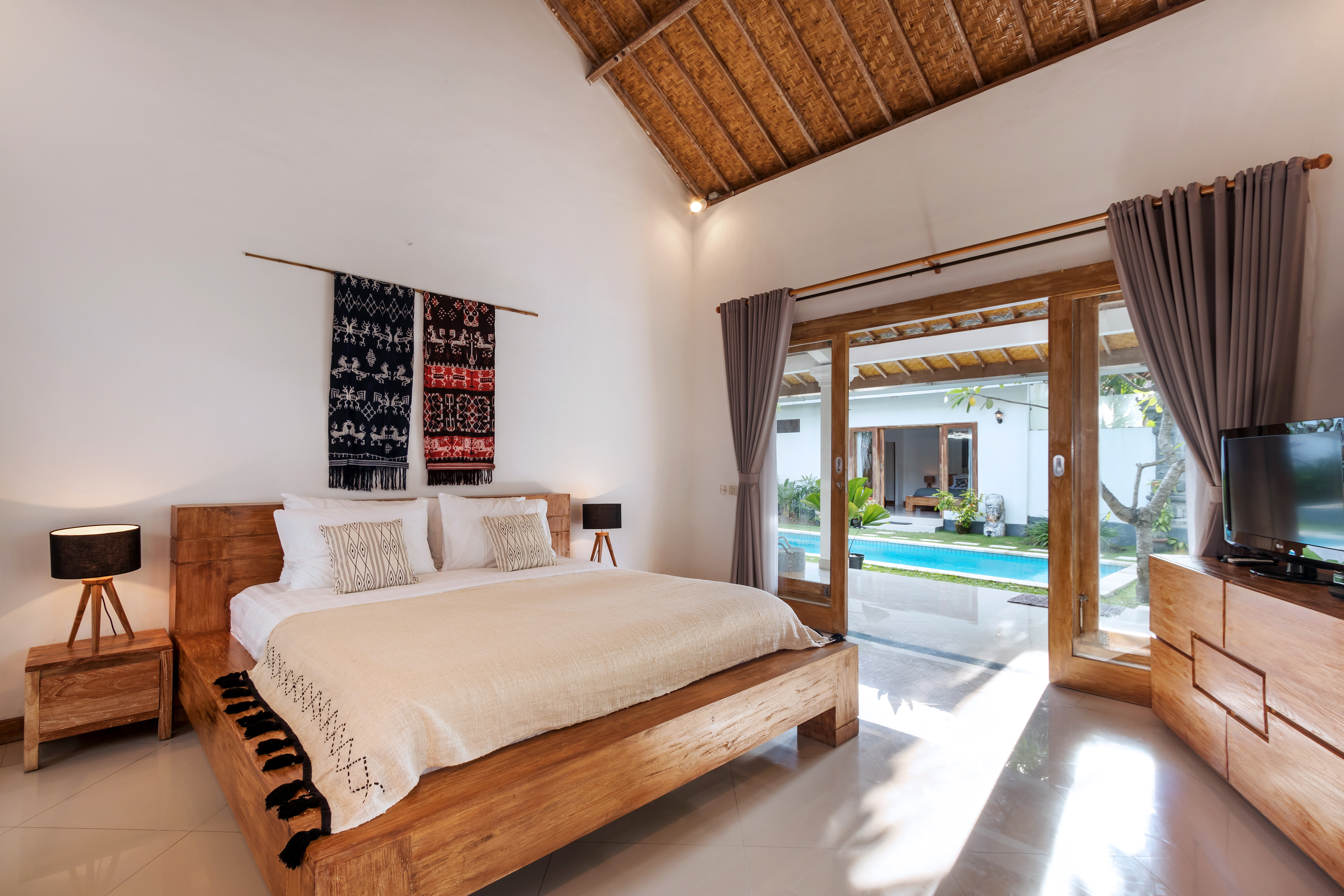 Thatch roof. Teak wood table. Teak wood wardrobe. Teak wood bed frame. Teak wood mirror. Rattan pendant lights. Straw baskets. Sisal rug. Teak wood doors and beams. How could you be too natural when it comes to leverage the sustainable, eco friendly furniture and home decors? In an island like Bali? Closer to nature tropical climate?
