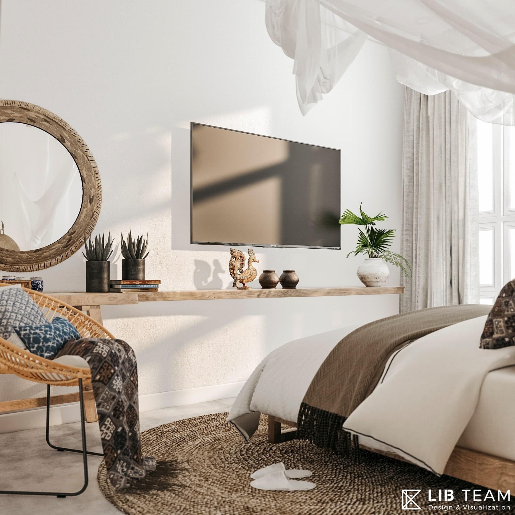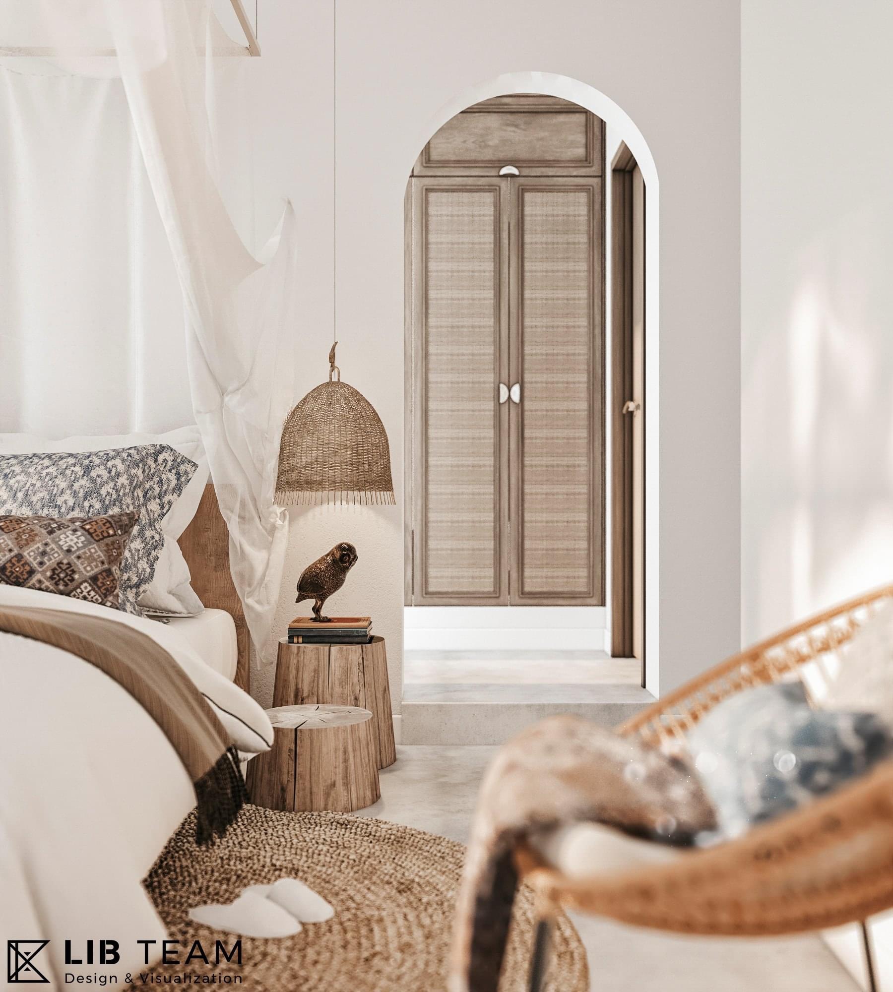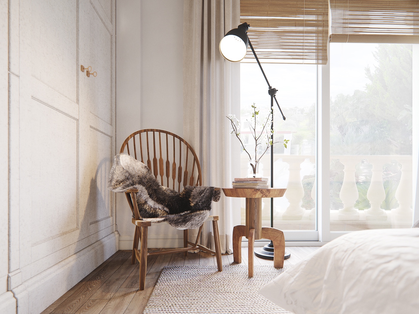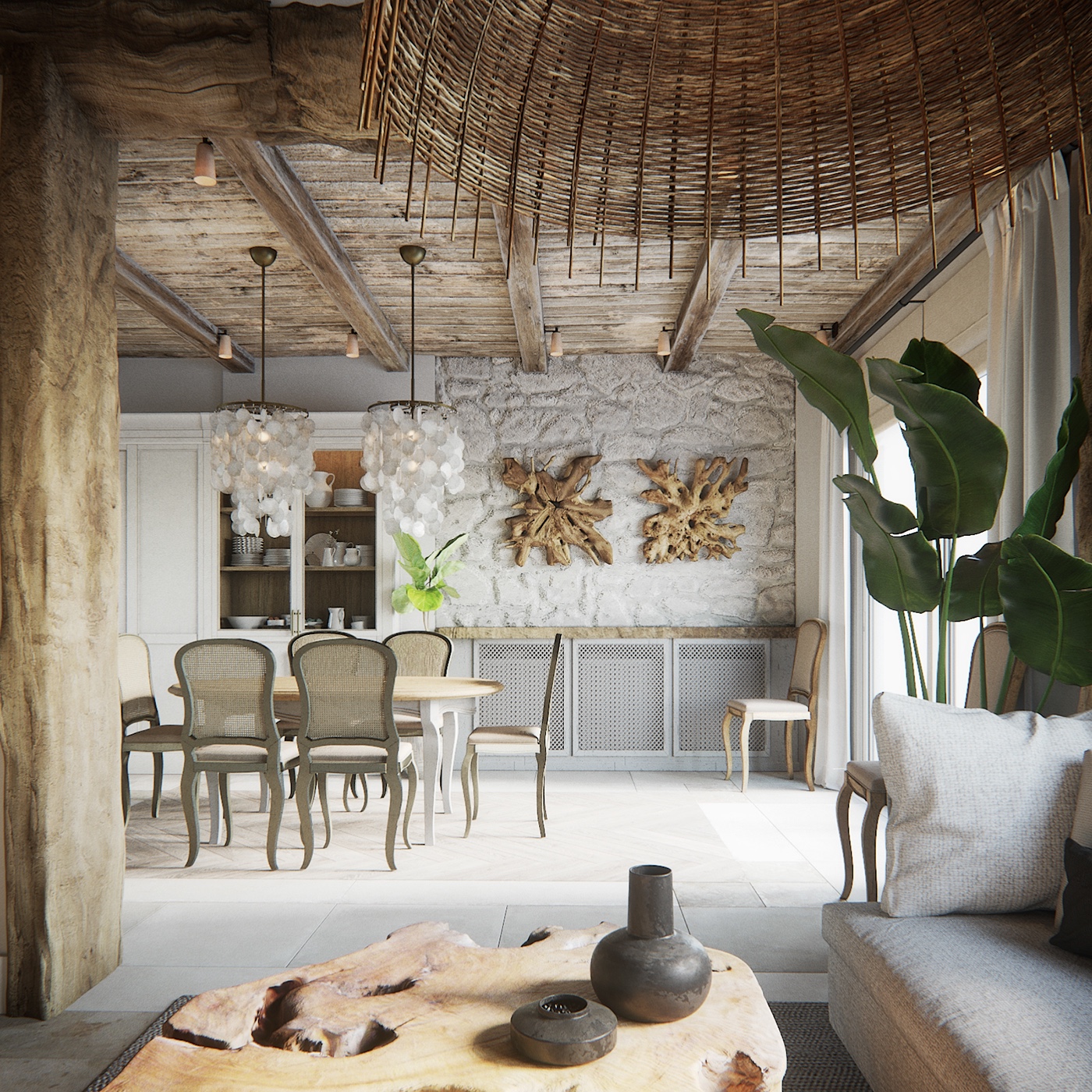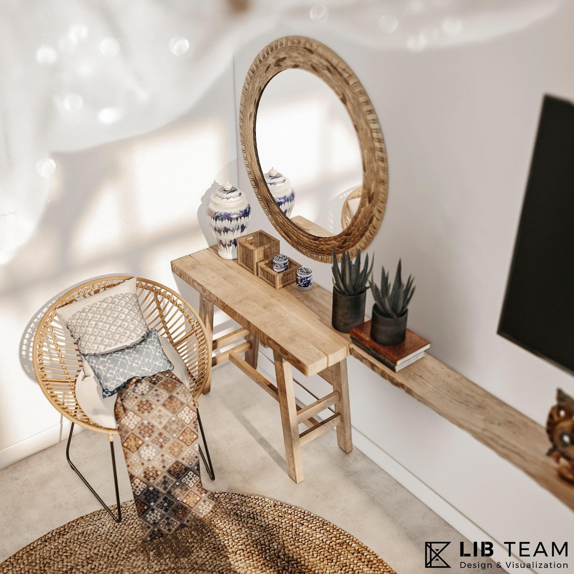 Jenya Lykasova created this visualization to entertain the rustic modern spirit in us. Her monochrome neutral filled with wood and rattan home decor truly captured our Mediterranean style admiration.