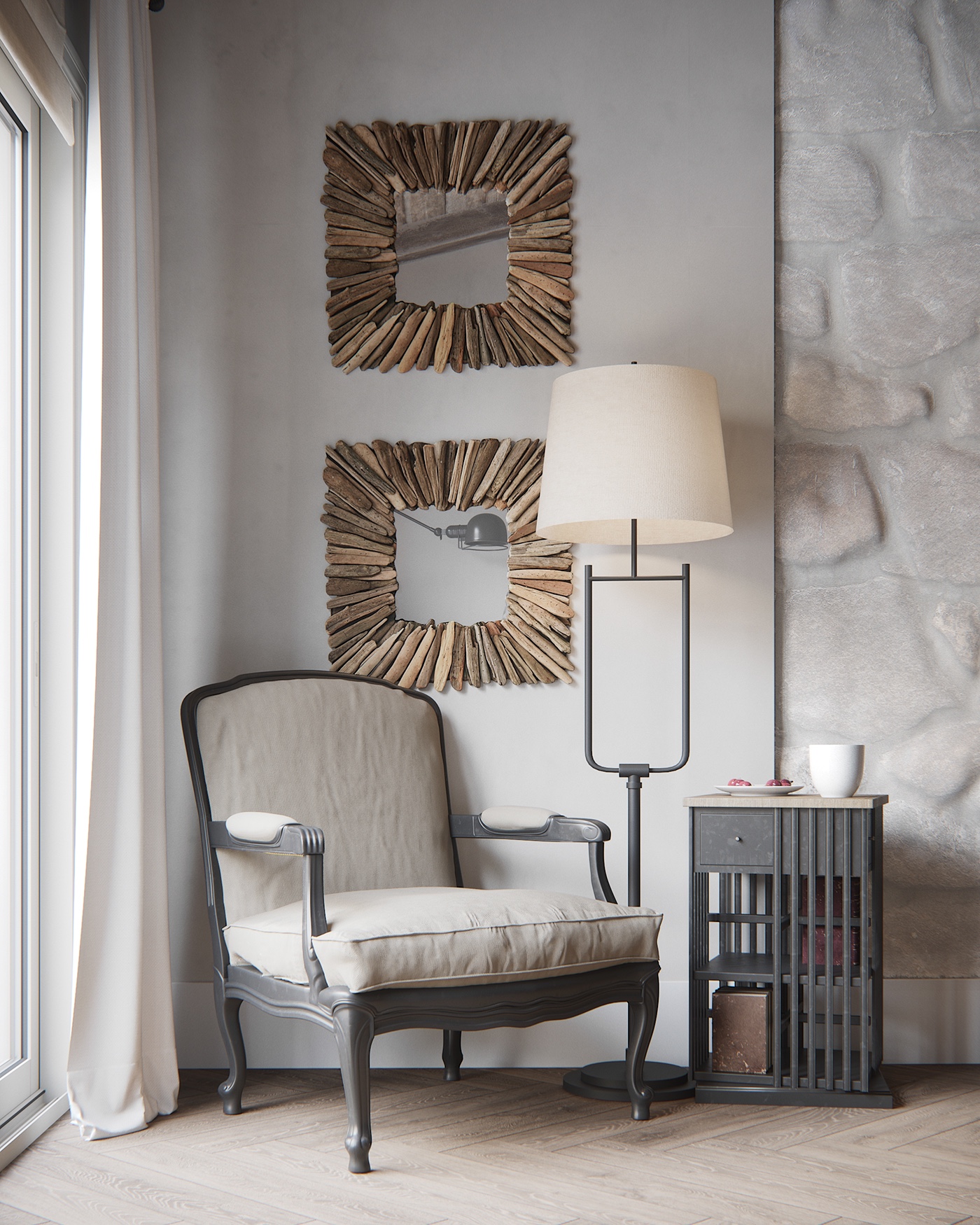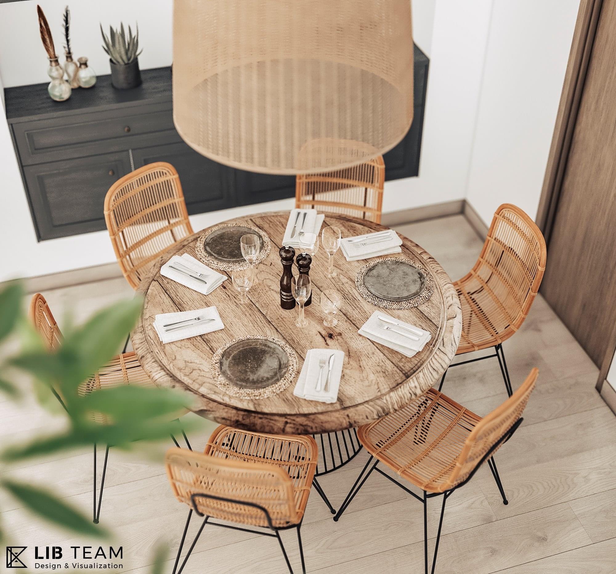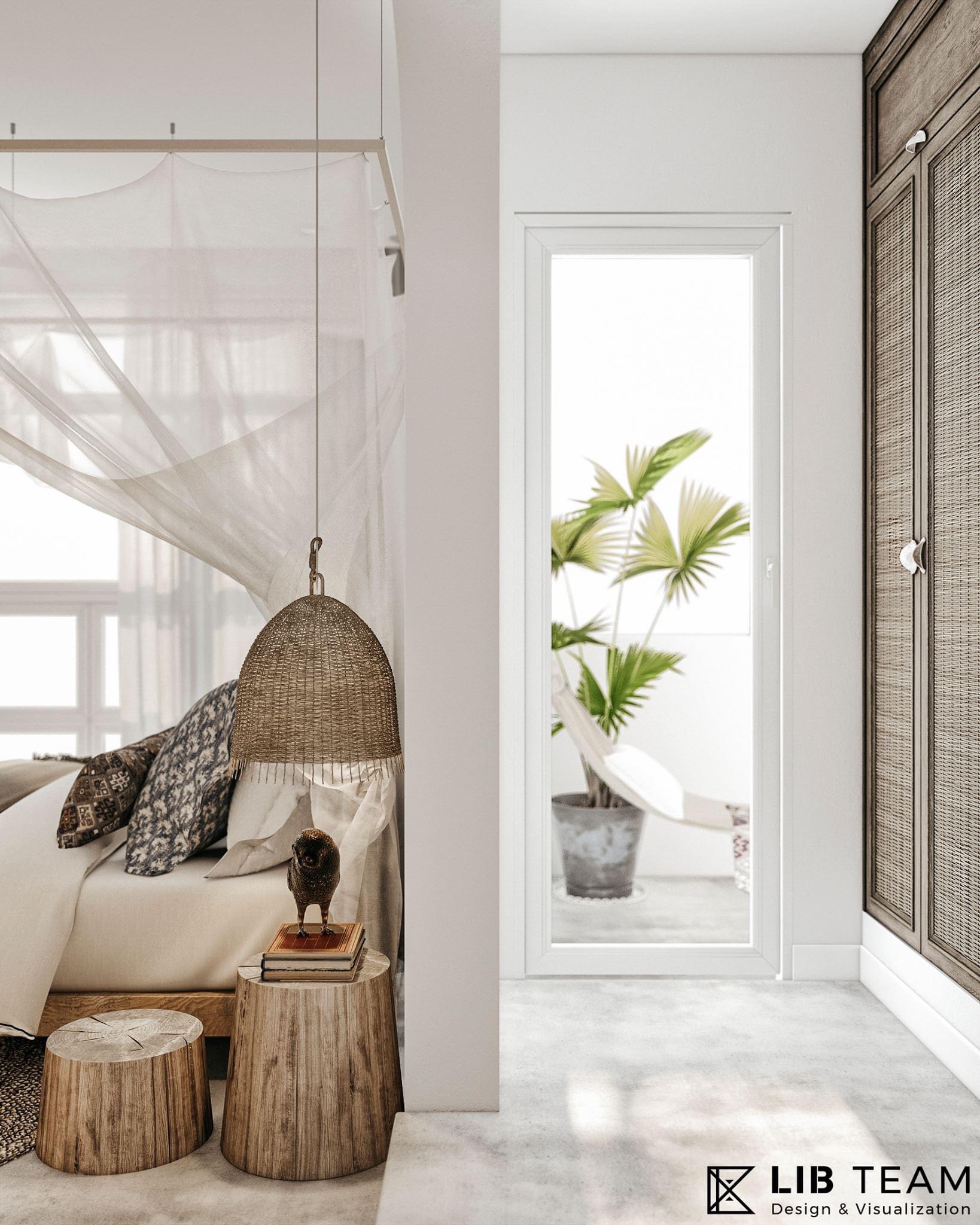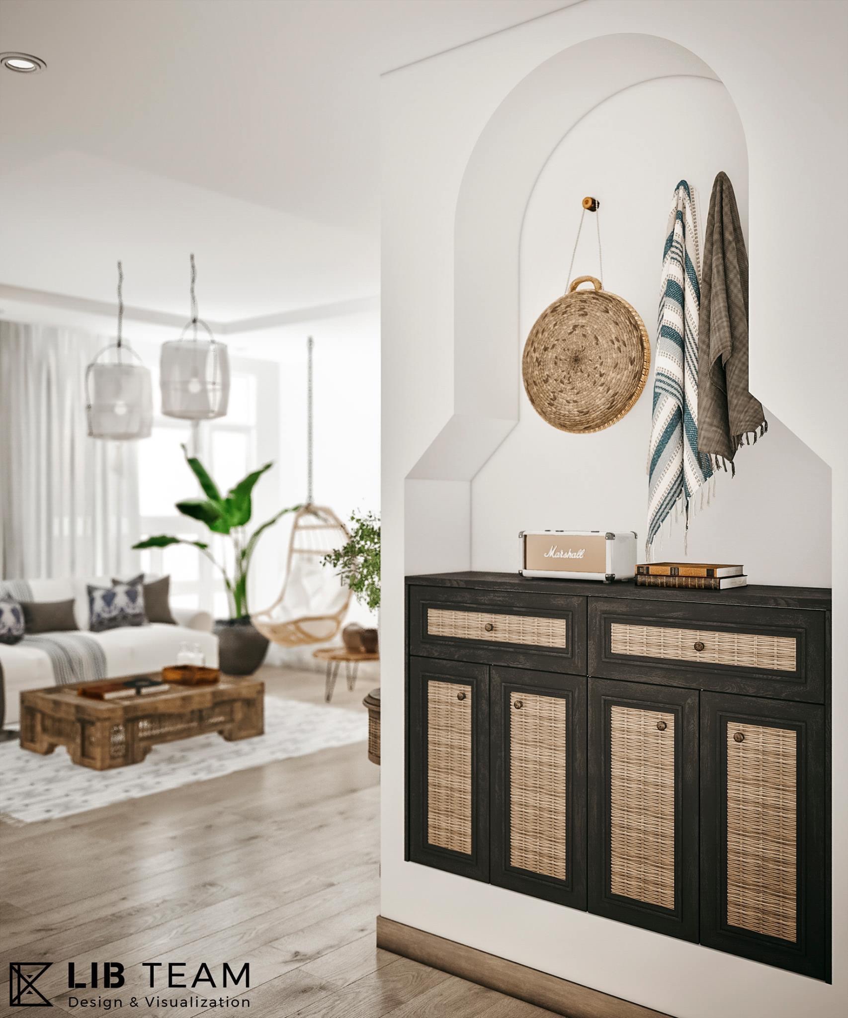 Jenya Lykasova created this visualization to entertain the rustic modern spirit in us. Her monochrome neutral filled with wood and rattan home decor truly captured our Mediterranean style admiration.