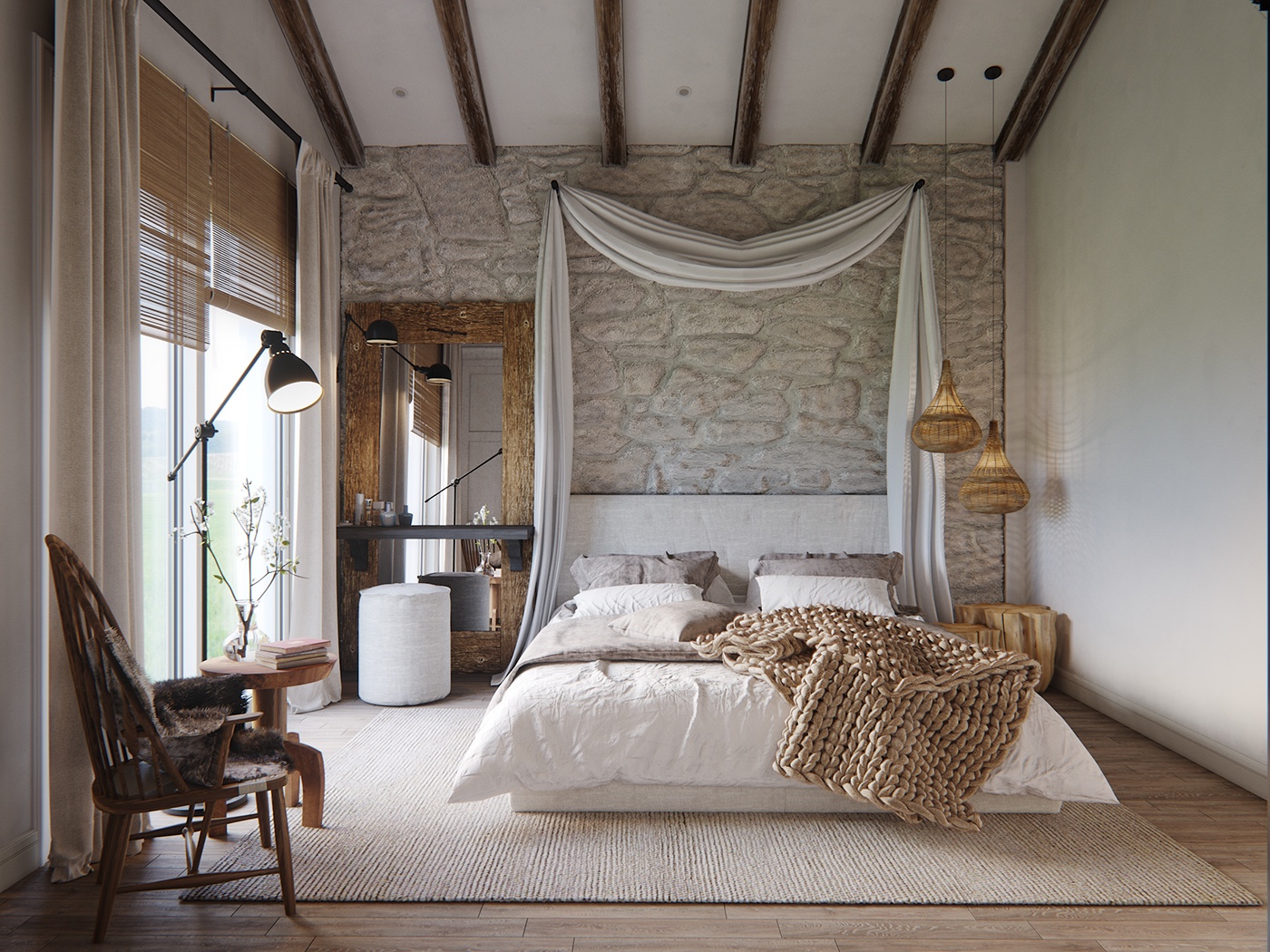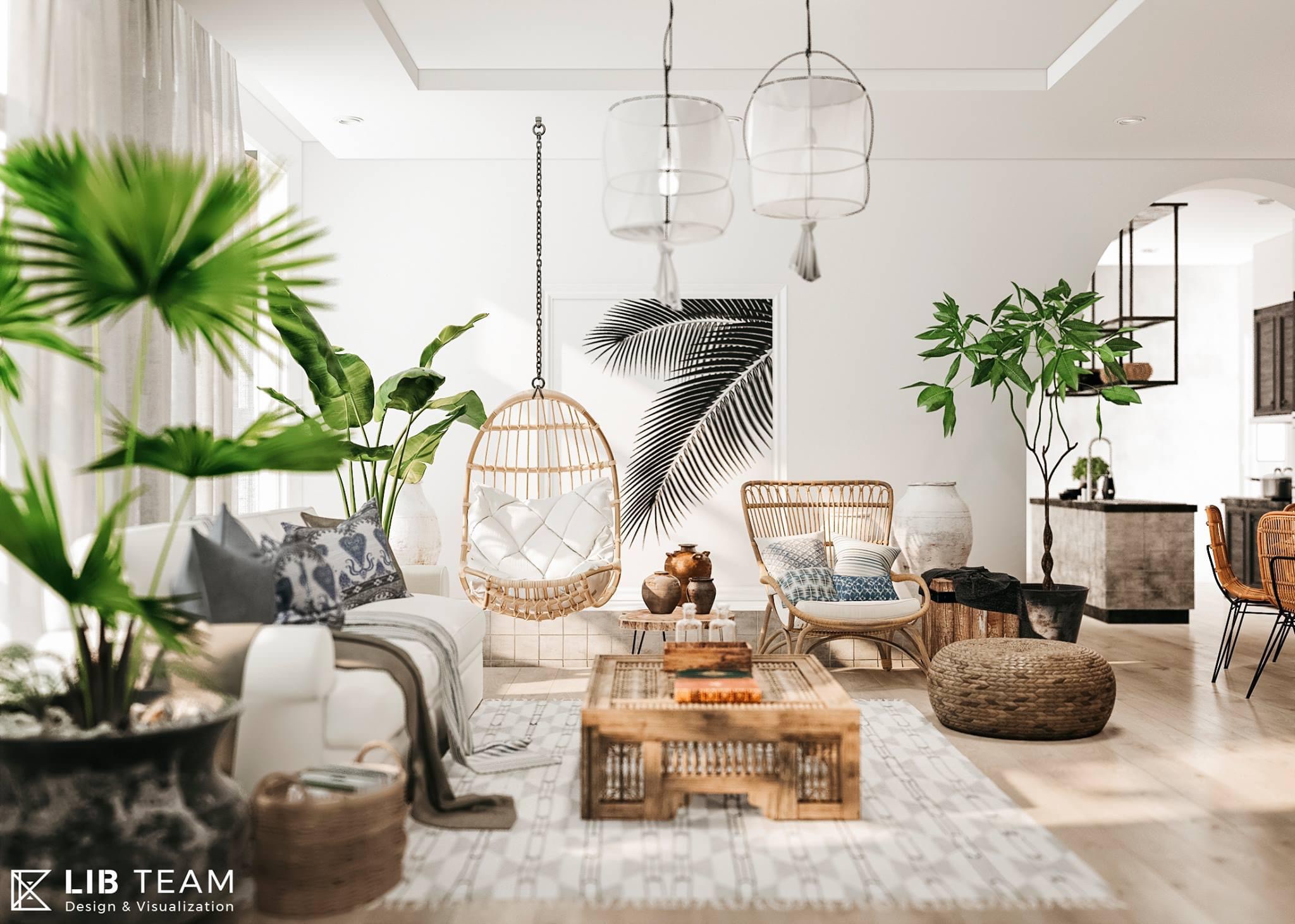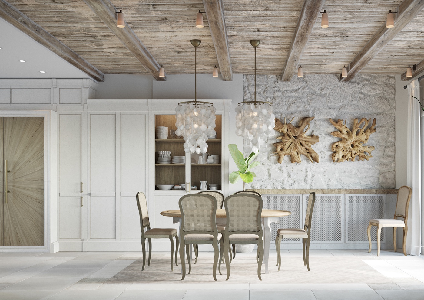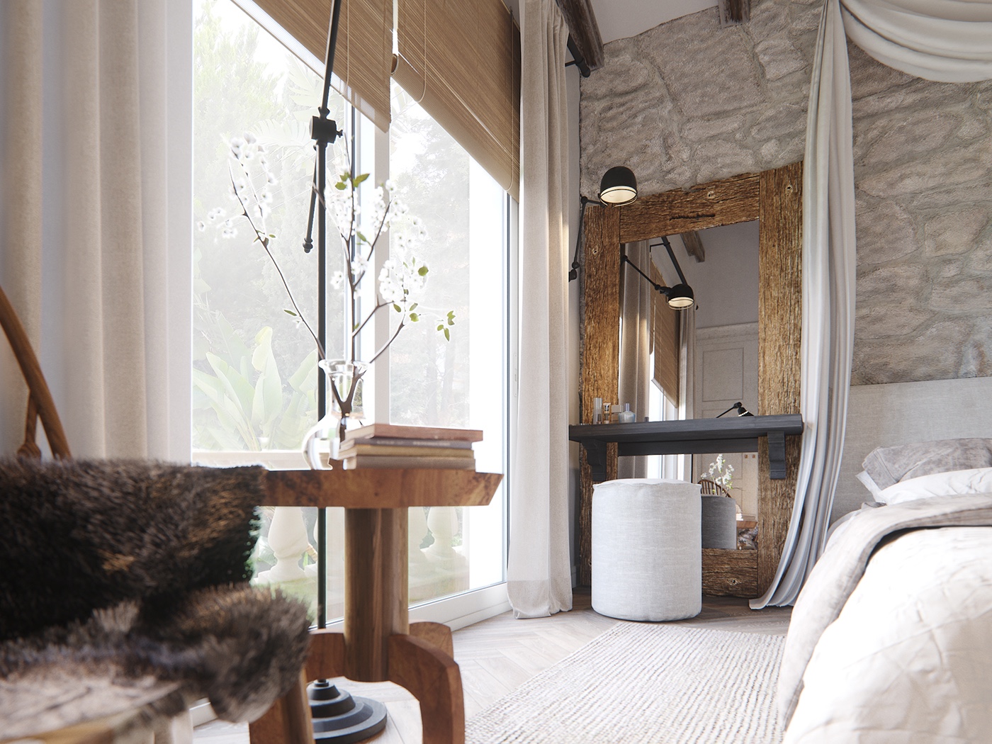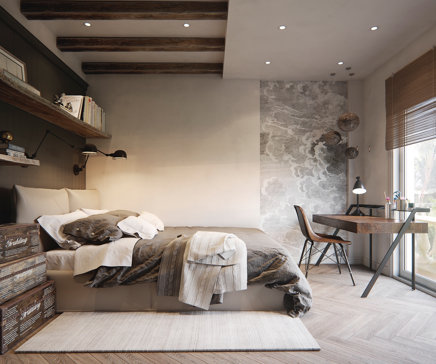 Jenya Lykasova created this visualization to entertain the rustic modern spirit in us. Her monochrome neutral filled with wood and rattan home decor truly captured our Mediterranean style admiration.