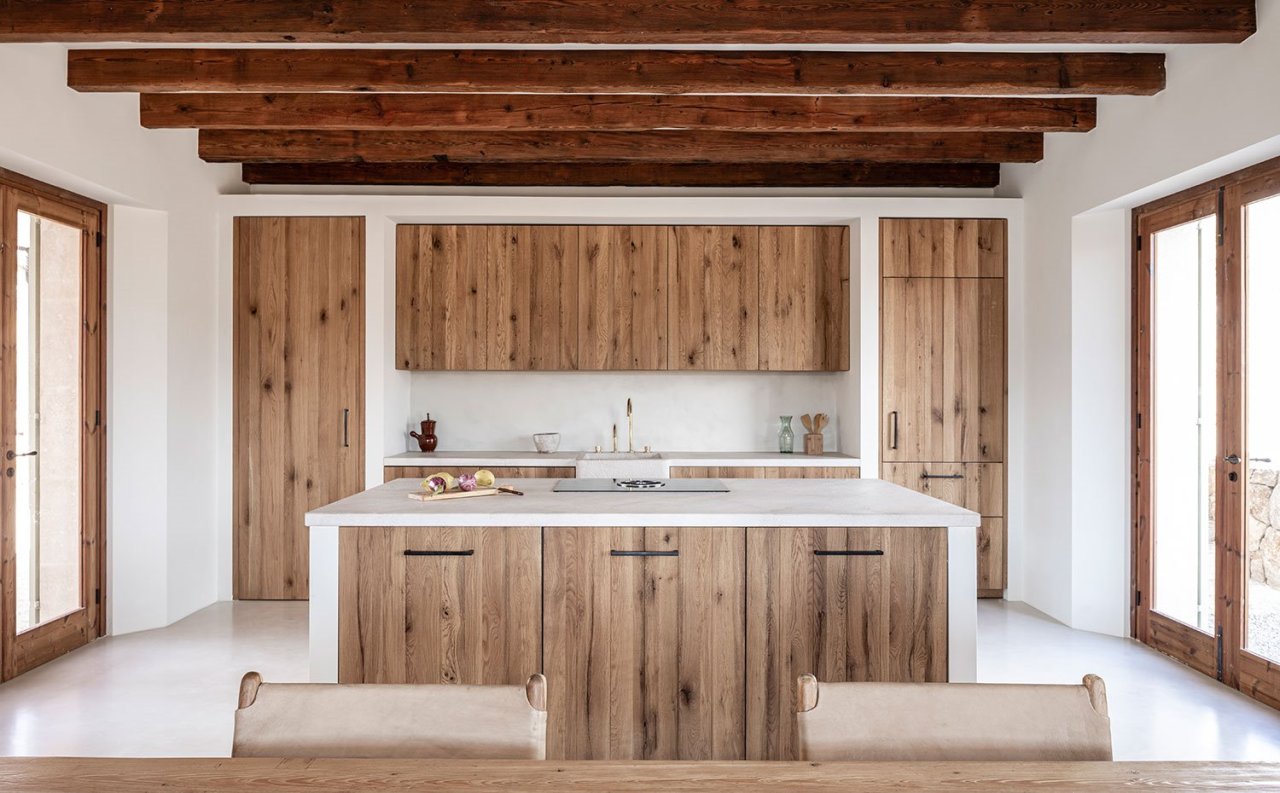 The kitchen, characterized by its natural slatted wood finish and black handles, has a wall-mounted work front and a large island where the cooking area is located.