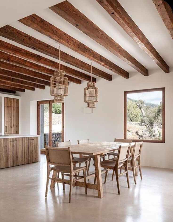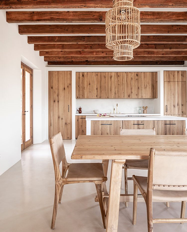 A pair of rattan pendant lights and solid teak dining chairs opt for a natural wood finish, emphasizing the feeling of warmth of the space.