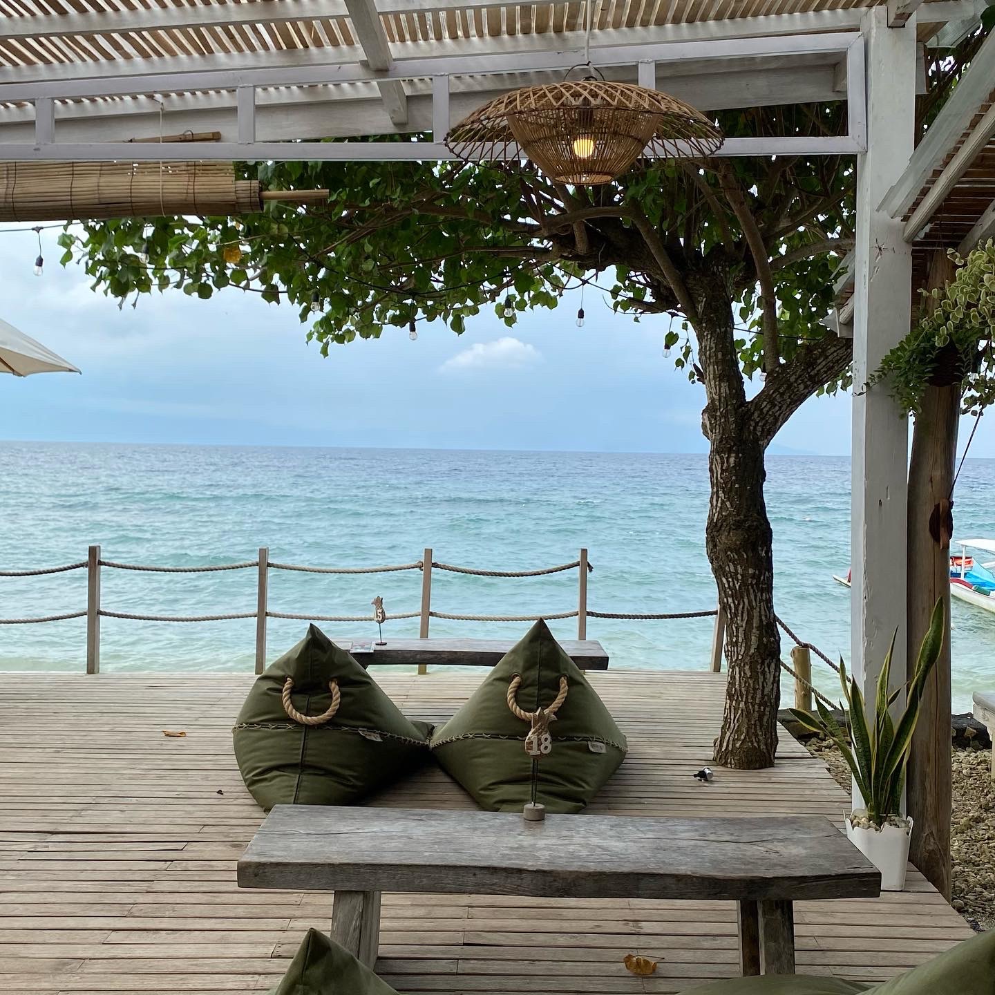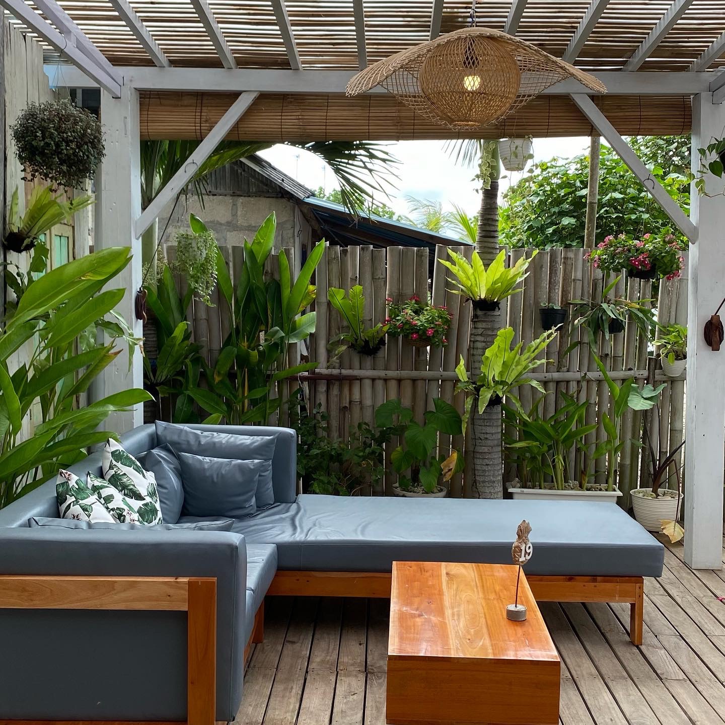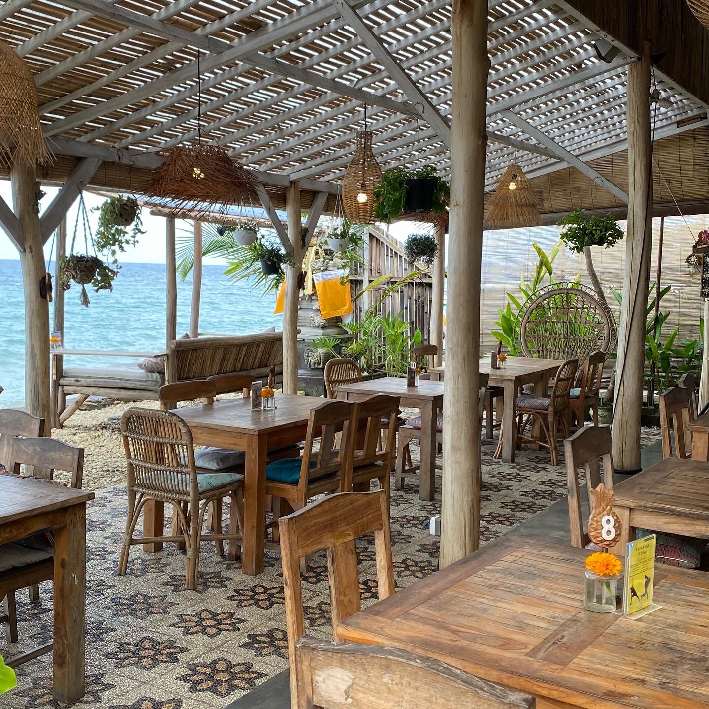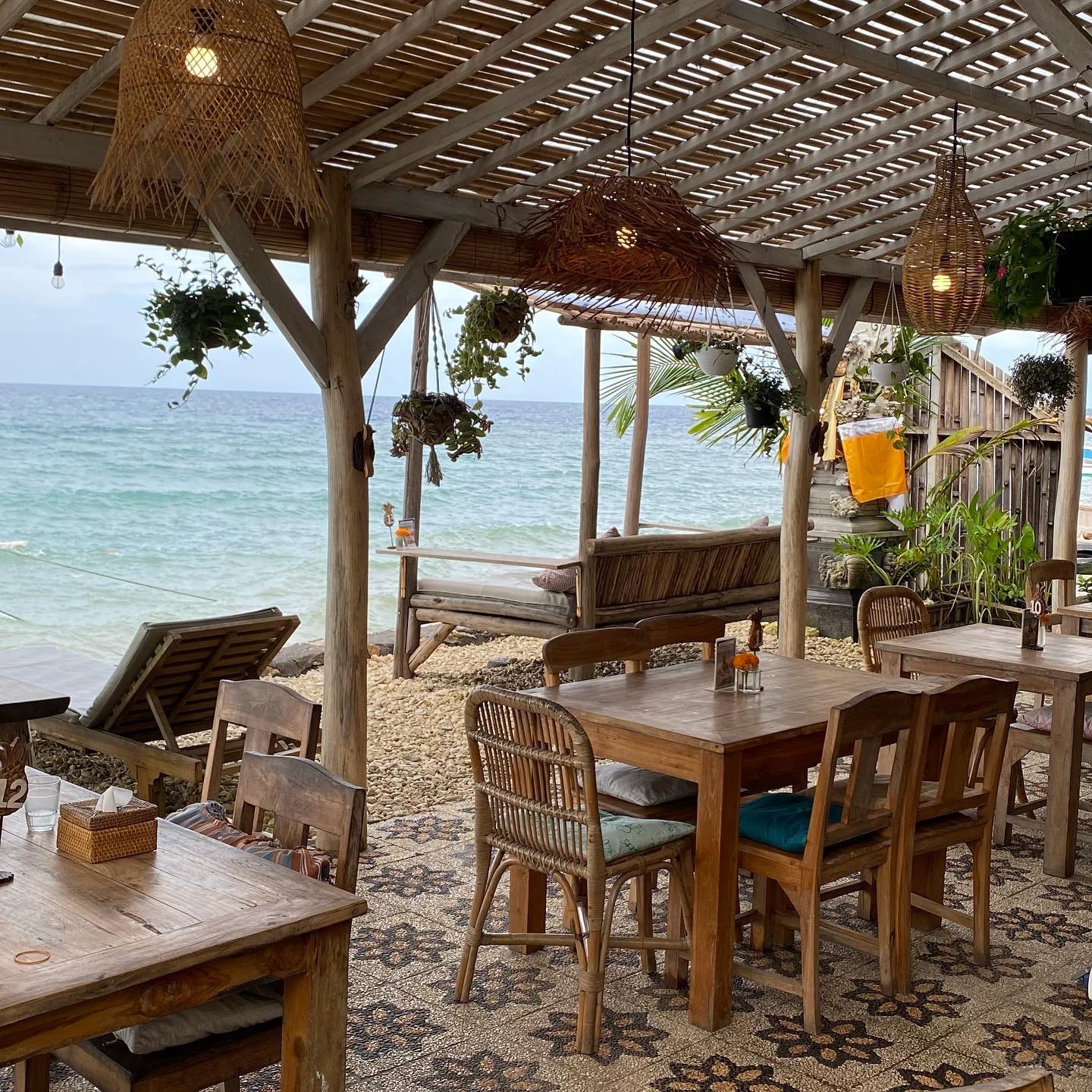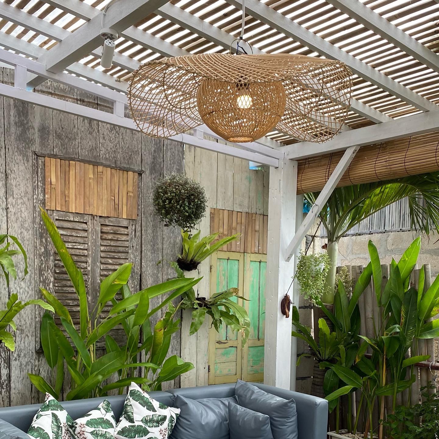 Beautiful restaurant interior and exterior using rattan pendant lights and wooden furnitures.