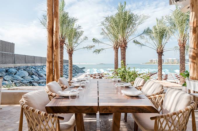 The outdoor terrace is a highlight of Nammos Dubai, designed to take full advantage of its beachfront location. Stylish, comfortable loungers and chic dining sets are arranged to provide panoramic views of the sea. The terrace is adorned with lush greenery and subtle lighting, creating a relaxed yet elegant setting for alfresco dining. Shaded areas and cooling misters ensure comfort even during the warmer months, making it a perfect spot for enjoying the coastal breeze and scenic sunsets.
