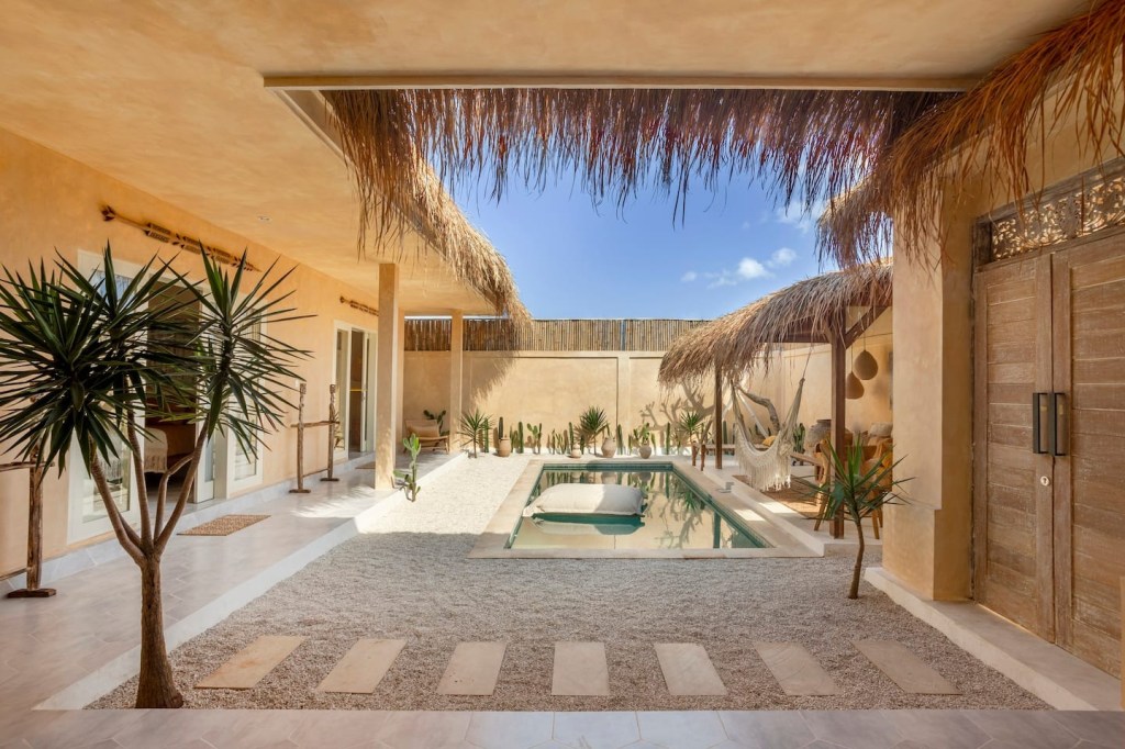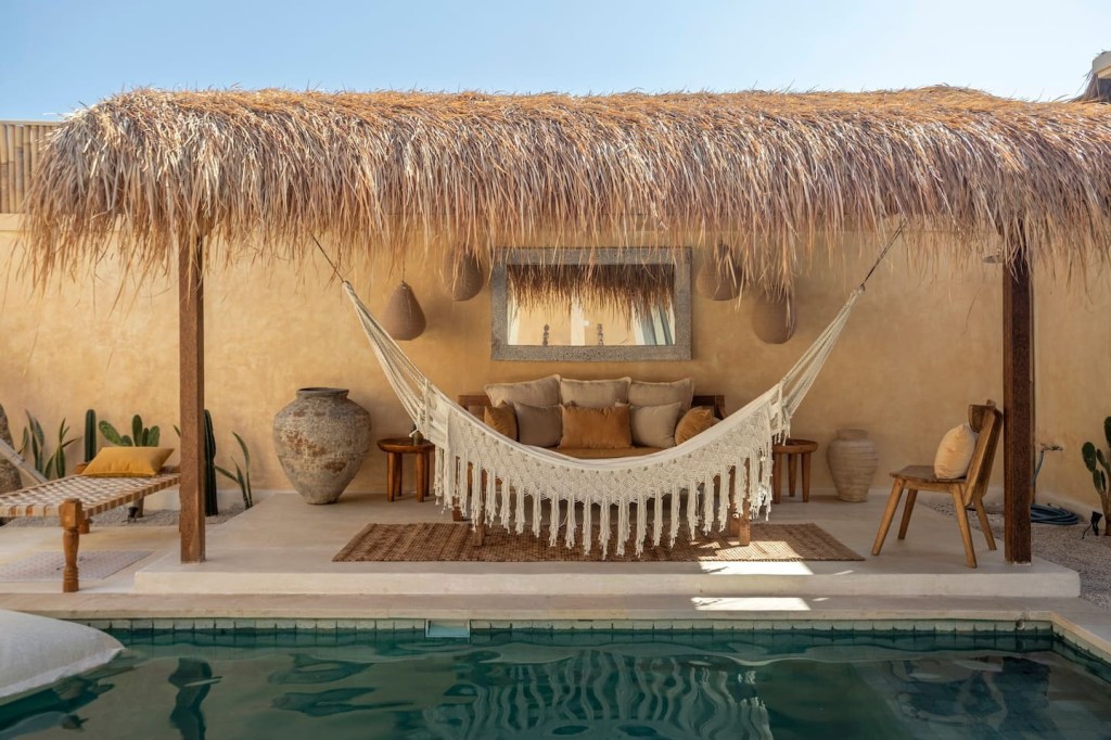 Envision a functional space resembling a rustic cabana featuring a charming thatched roof with bamboo frame, perfectly complemented by a hanging crocheted hammock by the poolside, inviting relaxation and leisurely afternoons.