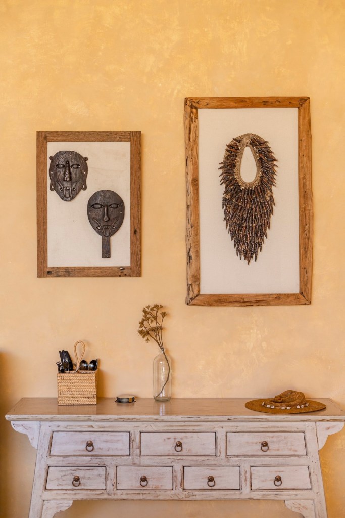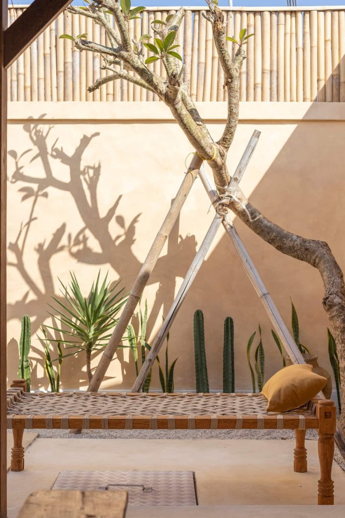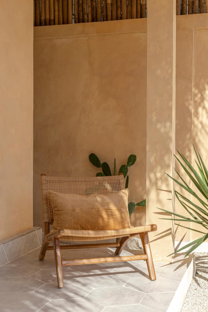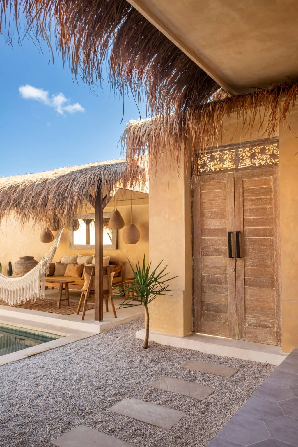 A back door crafted from teak wood adds a rustic charm to the exterior setting, enhancing the natural beauty and warmth of the space.