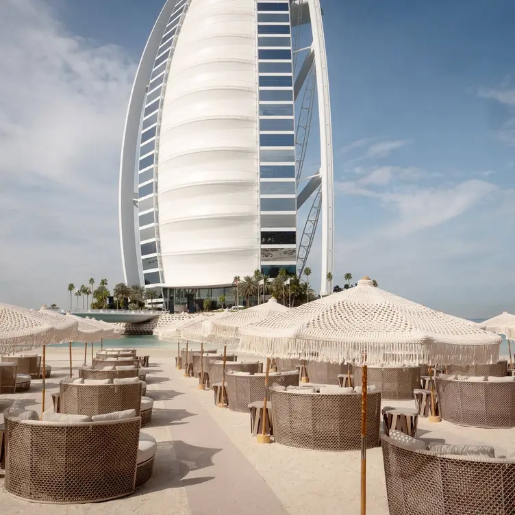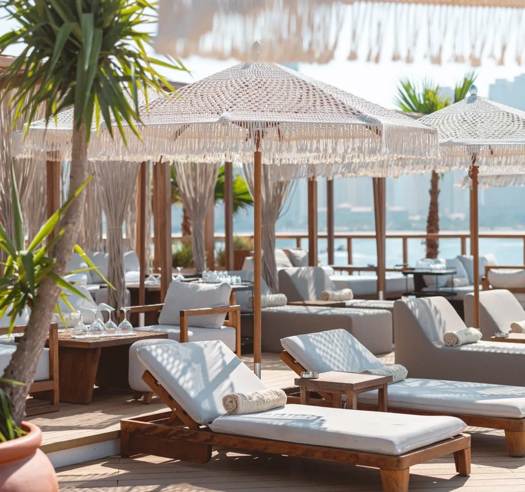Plush off-white cushions enhance the seating experience, keeping in line with the beach club’s relaxed yet opulent vibe.