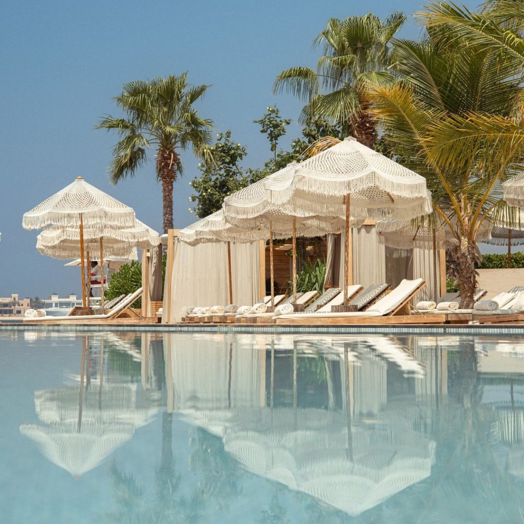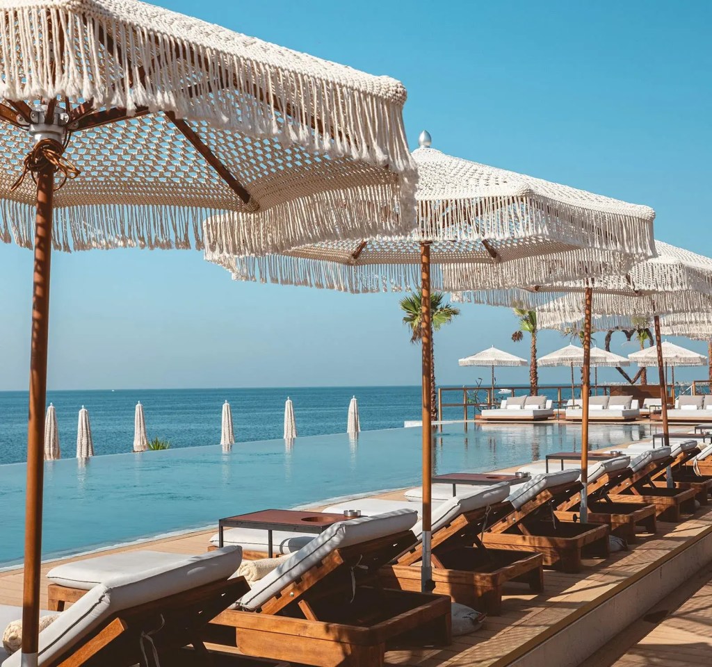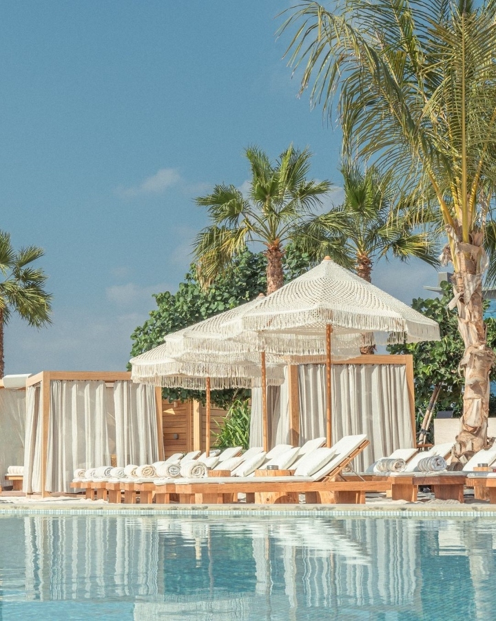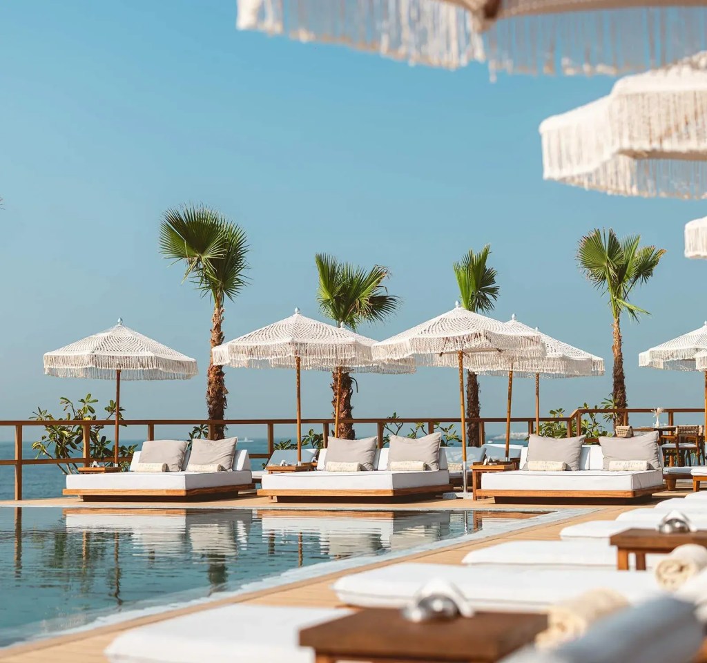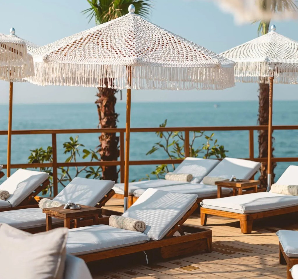 Verde Beach Club exudes an effortlessly luxurious yet relaxed atmosphere, blending white bohemian aesthetics with a modern twist. The carefully curated furniture and furnishings play a significant role in achieving this refined yet laid-back ambiance.