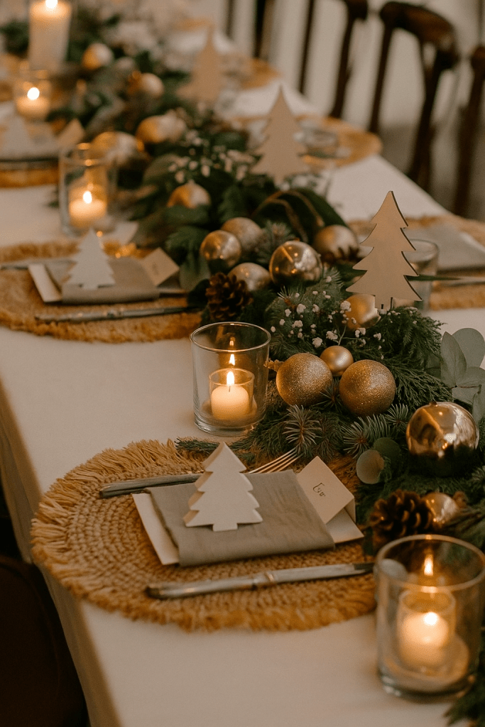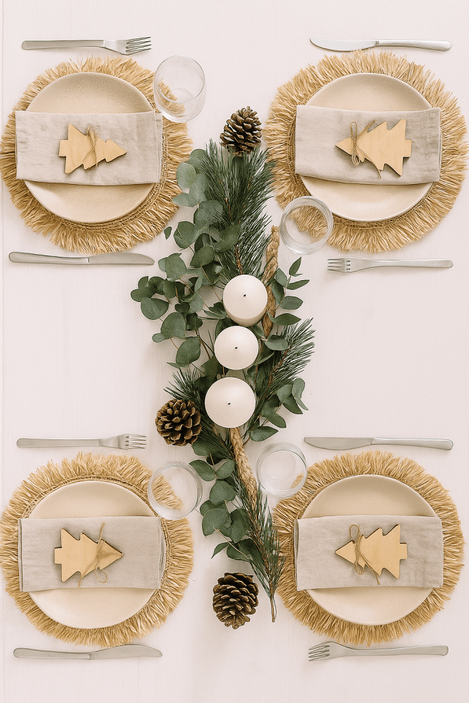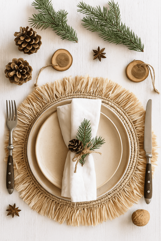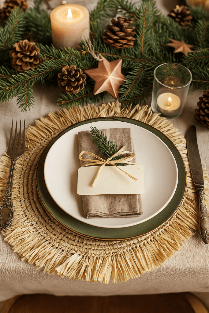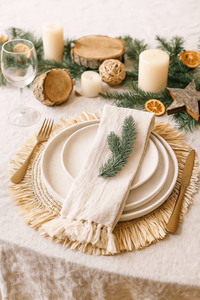 Transform your holiday dining experience with a boho Christmas table setting featuring natural elements and vibrant colors. Begin with soft, textured linens in earthy tones as your tablecloth, topped with raffia placemats for a rustic touch. Layer mismatched ceramic or wooden dishware that embodies a free-spirited vibe. Use greenery, such as eucalyptus or pampas grass, as a centerpiece, along with candles in varied heights for warmth. Finish with woven napkin rings and a few handcrafted ornaments to evoke a cozy, festive ambiance that celebrates individuality and charm.